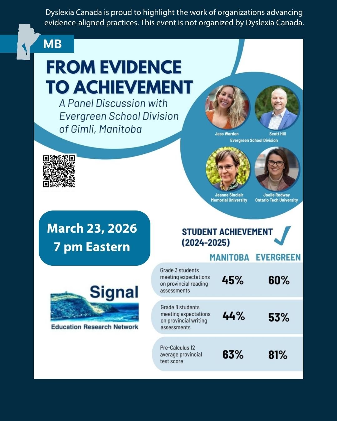 We are pleased to share an upcoming event featuring one of the recipients of the 2024 Dyslexia Canada Educational Excellence Award. Evergreen School Division in Gimli, Manitoba, will be featured in a panel discussion highlighting the work they have done to improve student outcomes through evidence-aligned literacy instruction.