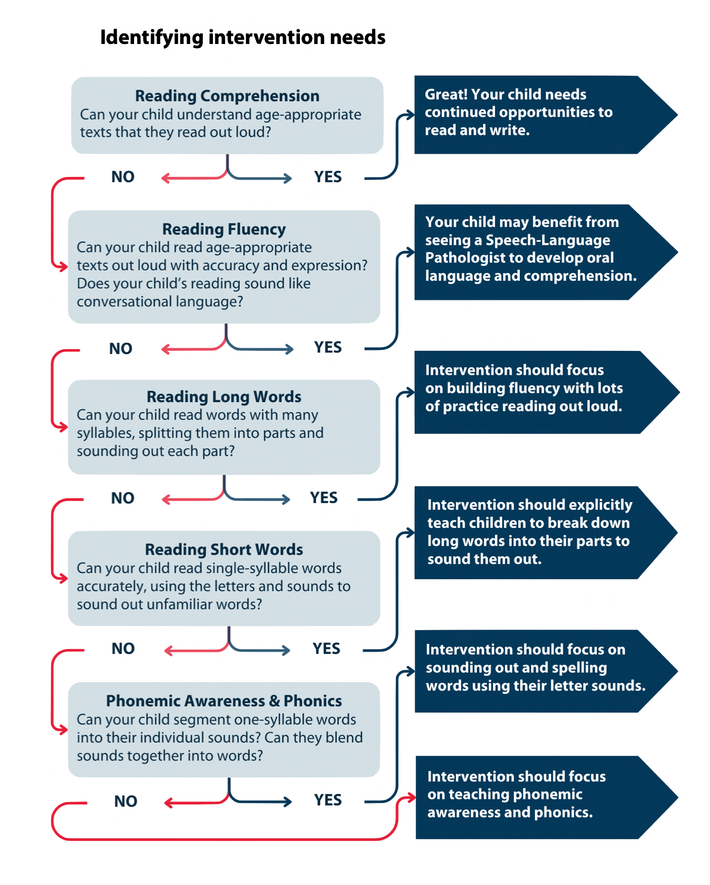 The flow chart below can help you and your child’s teacher identify the specific skills to target through intervention. For children in grade 2 and younger, start at the bottom with Phonemic Awareness & Phonics and work your way up; for children in grade 3 and up start at the top with Reading Comprehension and work your way down.